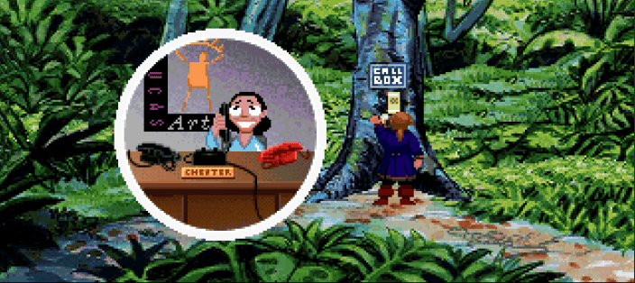 The system in Thimbleweed Park is delivered through the telephones in the game – in the mansion, as well as the city. You would call a number that you found on a placard. Using one of the phones, you call a number to engage with the system – and get hints about where to go next.