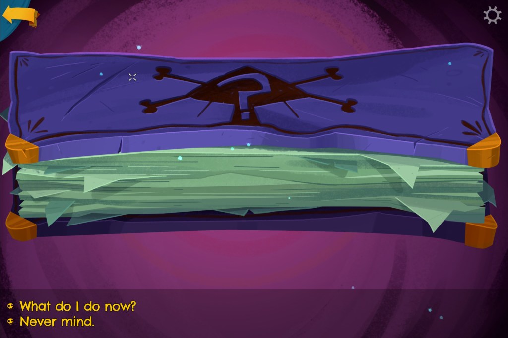 The new Monkey Island’s hint system, that would give you a hint or two if you’re stuck on a puzzle, has a fairly clever design. As part of your inventory, you can access the “hint book” at all times. The hint book is contextual, so it knows in which part of the game you’re currently at, suggesting very accurately, where it may help you. It’s not giving away the solutions right away, though. The hint system would give you multi-layered hints: it gives you some information and if that doesn’t help you, you can ask for more, and the system would continue to give you increasingly direct hints until it gives you the solution after 4 or 5 rounds. First, after you selected the part of the game you struggle with, it will first give you reminders about what the puzzle at hand is about – things you make have heard or subtly been nudged about in previous dialog or surroundings.
