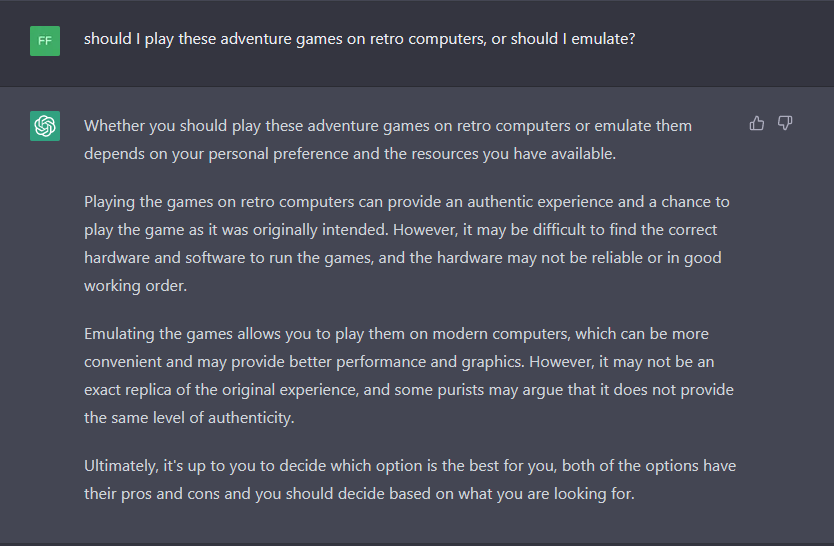 I’ve asked ChatGPT what it thinks about playing games on retro/old hardware vs. emulation: