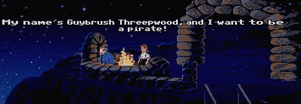 While that’s how you’d expect a game to behave, if you look at The Secret of Monkey Island, you’ll notice there’s very little context you get. The first scene is literally Guybrush showing up at the lookout, opening with “Hi! My name’s Guybrush Threepwood, and I want to be a pirate!” – and that is setting off the adventure. There’s no context setting and no backstory about Guybrush, what drives him to become a pirate or how he ended up on Melee Island.