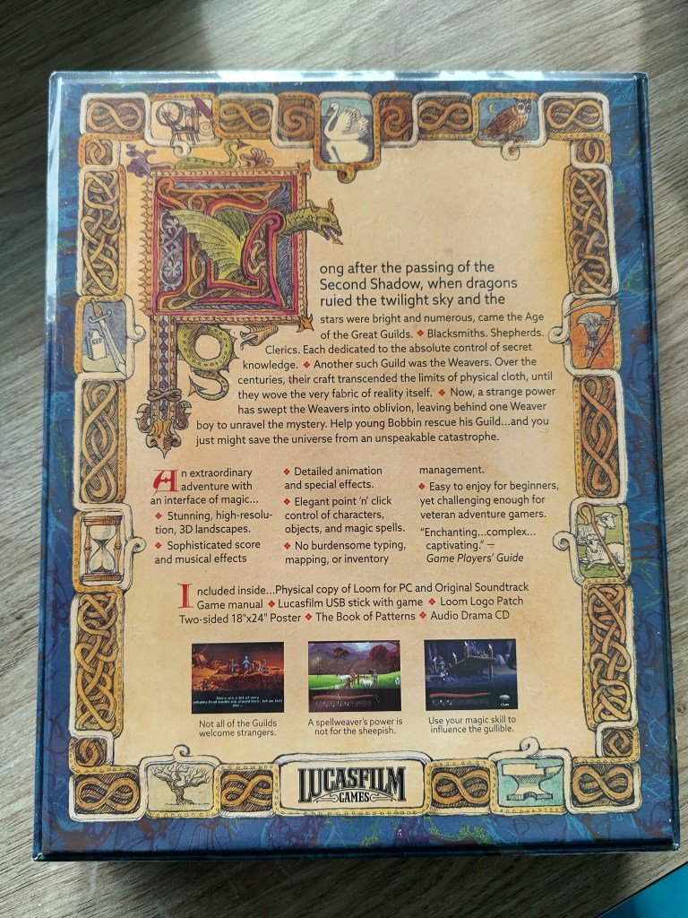I bought myself the remake for the Lucasfilm adventure Loom. Despite the fact that I own a big box version of Loom for the Amiga from the original time, the rerun from limitedrungames offered a number of inbox gimmicks that I wanted to have. There is a two sided large poster with on one side the original art box to hang on your wall or on the other side and interesting alternate poster that I’ve never seen before (it’s the same picture as the one on the collector card below). It also comes with the manual and the book of patterns as well as the audio drama that all were in the original big box, just remade and just re-released on modern media. The audio drama originally was put on a cassette and I have a hard time finding a cassette player these days, if I don’t want to get in trouble with the children in my neighborhood. Other gimmicks include the infamous red filter glasses to work with the copy protection.